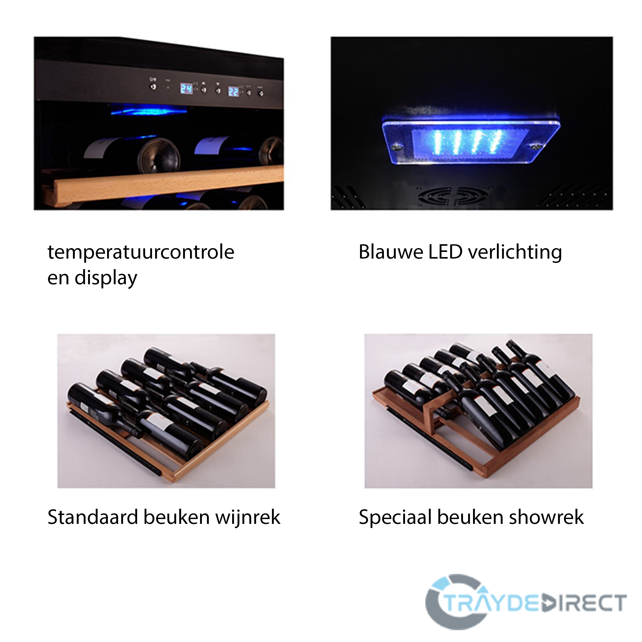 Tevens zijn er speciale showlades waar je de unieke wijnen mooi kan etaleren. Hij is voorzien van een glazen (dubbelglas) deur en beschermt tevens de wijnen tegen UV.